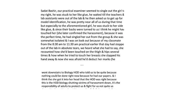 The latest incident occurred when a school student in Bahria College, Islamabad, was allegedly sexually harassed by Sadat Bashir, an external examiner, who was conducting her Biology practical exam.