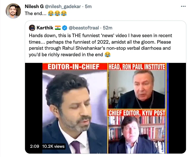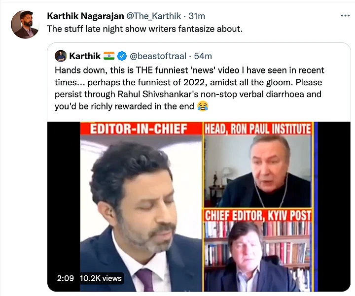 We still weren't over Arnab Goswami getting schooled by a panelist on his own show, when Times Now's Rahul Shivshankar gave us another treat. The editor-in-chief of the news channel was moderating a discussion about the current Russia-Ukraine crisis with two other panelists.