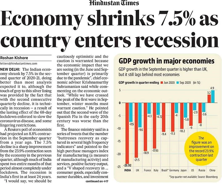 India’s official Gross Domestic Product figures for the second quarter, from July to September of the financial year 2020-21, contracted by 7.5 percent. This marks India’s fall into its first ever technical recession after two straight quarters of GDP contraction since it began releasing quarterly estimates of GDP in FY98.