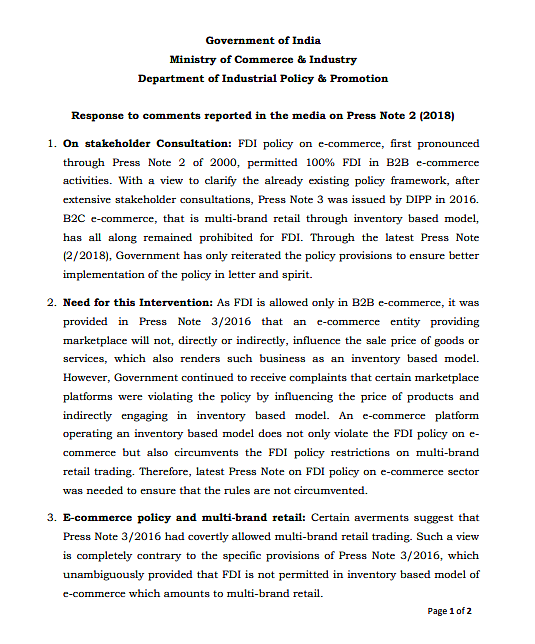 In it's clarification, the DIPP specified that "FDI is not permitted in inventory based model of ecommerce, which amounts to multi-brand retail."