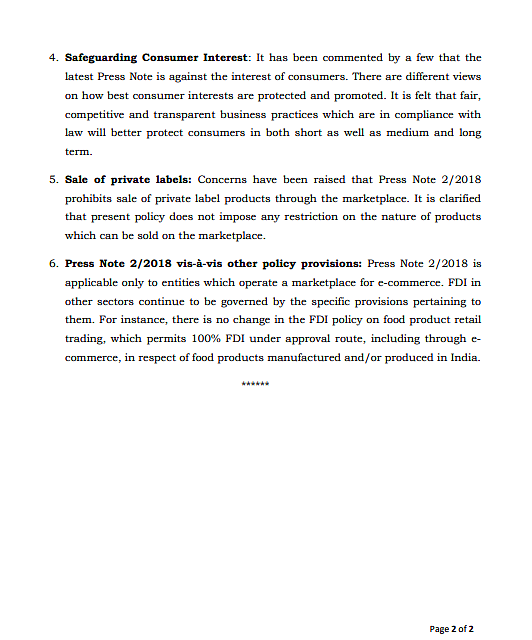 “Concerns have been raised that Press Note 2/2018 prohibits sale of private label products through the marketplace. It is clarified that present policy does not impose any restriction on the nature of products which can be sold on the marketplace.”DIPP, in clarification.