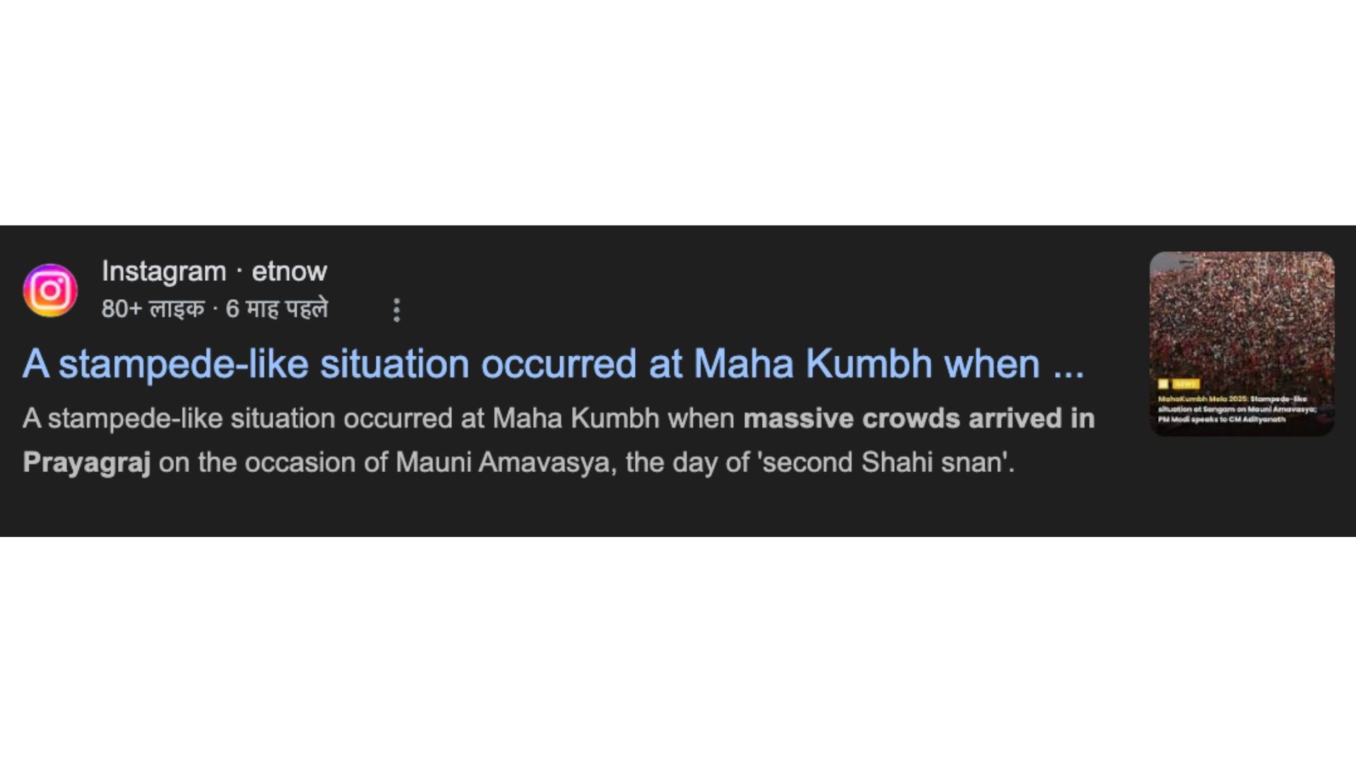 On 29 January, another case happened which killed thirty (as per officials) people, with several left wounded and displaced, happened in Prayagraj during the Maha Kumbh mela.
