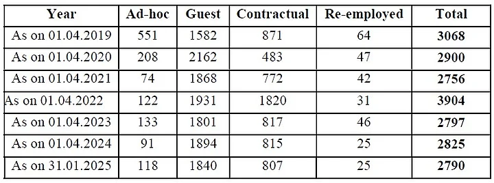 Data from the report shows that both regular and contractual appointments formed only a miniscule proportion of the total 1,388 sanctioned posts. For instance, as of 31 December 2024, 374 posts are vacant, and yet only 33 teachers were hired—which is less than 10 percent of the total vacancies and merely 2.38 percent of the total sanctioned strength.