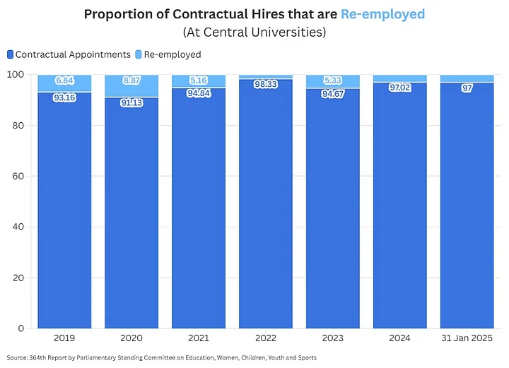 Another interesting data point emerged when we looked at the breakup of non-permanent teachers in central universities. A miniscule percentage— under 10 percent—of those hired contractually are actually re-employed.