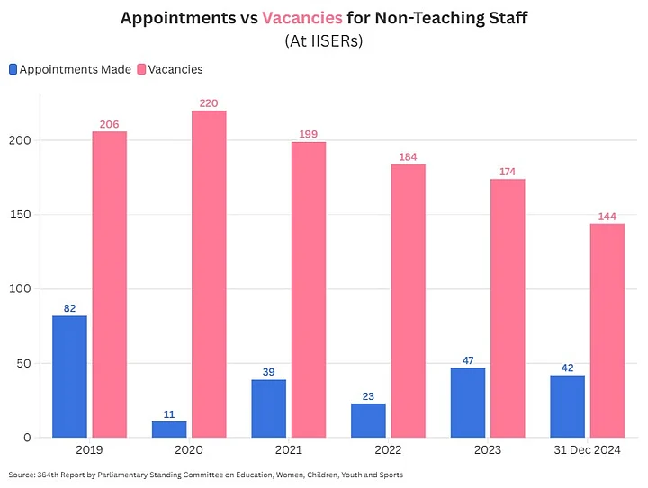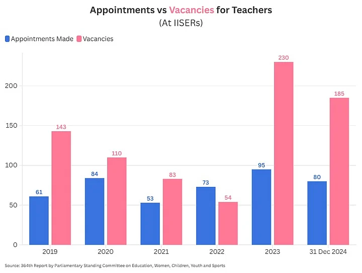 In the seven Indian Institutes of Science Education and Research (IISERs) located across India, there were 185 vacancies for different faculty positions in 2024. Yet only 80 or 43 percent of the total vacant posts were filled.