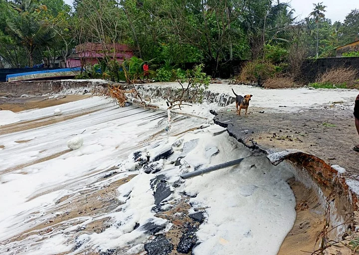 Alappuzha: Damaged road due to rough sea weather conditions owing to Cyclone Tauktae in the Arabian Sea, in Alappuzha