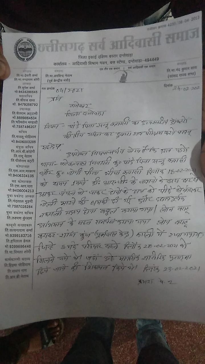 A day after she was found dead, a tribal outfit, Chhattisgarh Sarv Aadiwasi Samaj, met the Dantewada collector and sought an explanation for her death.