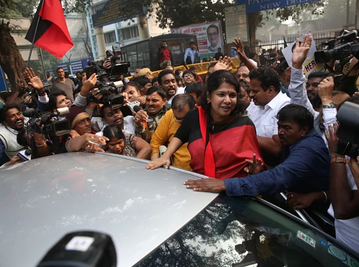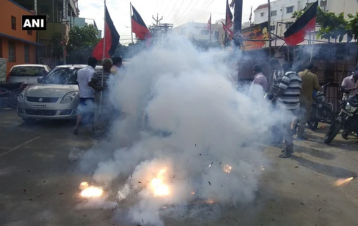 DMK supporters were seen bursting firecrackers outside the court complex and showered Raja and Kanimozhi with flowers as soon as they stepped out of court.