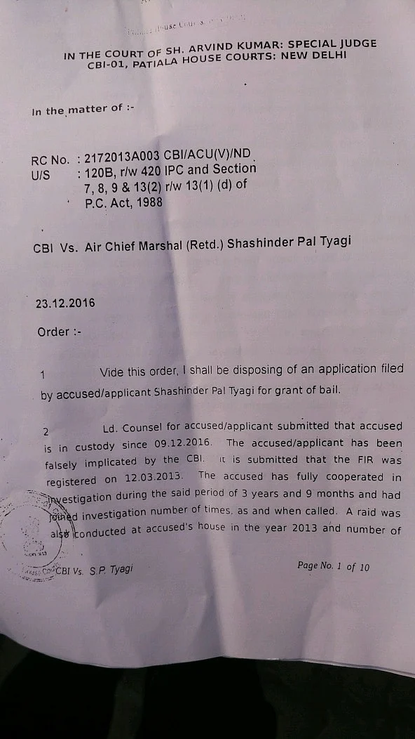 Former Air Chief Marshal SP Tyagi, arrested on 9 December on charges of receiving kickbacks in the multi-million-dollar AgustaWestland VVIP chopper deal, was given bail by a special court in New Delhi on Monday.