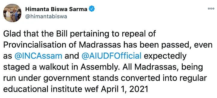 Biswa tweeted about the Bill being passed, saying the conversion of the Madrasas to regular government schools will happen by 1 April 2021.