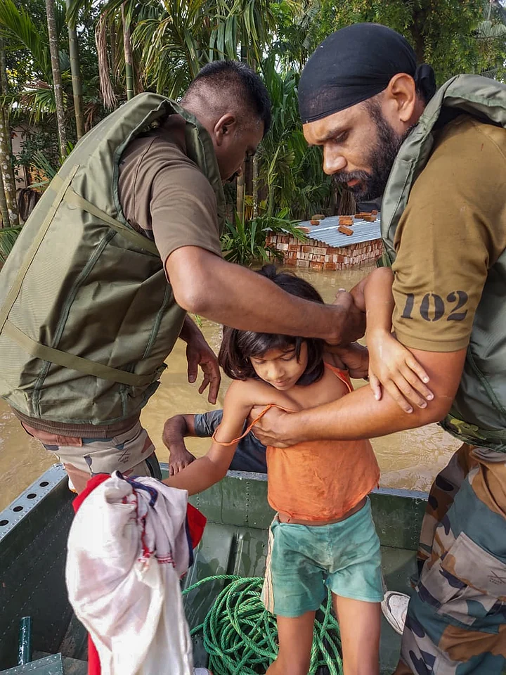 Blazing Sword Division of Gajraj Corps of the Indian Army evacuates a child during flood relief operations after heavy rainfall in Hojai district on 18 May.