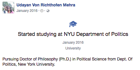 He had made up to six fake profiles on Facebook and the one he used the most was under the name Udayan Von Richthofen Mehra.