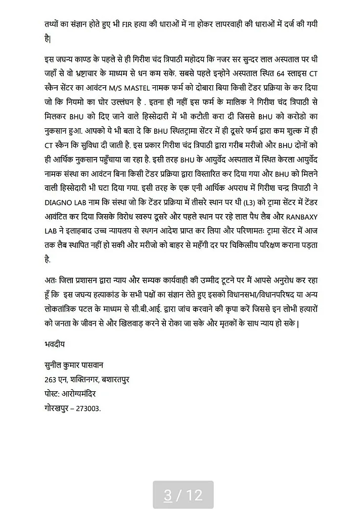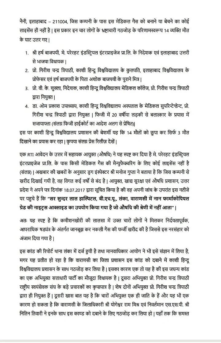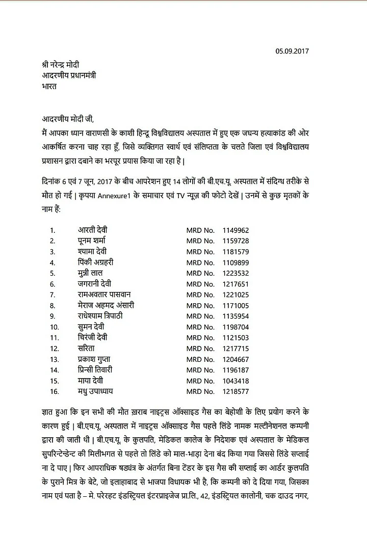 In June 2017, Azamgarh based social activist, Sunil Kumar Paswan, had written a letter to Prime Minister Narendra Modi, alleging corruption in supply of anesthesia to the hospital. The letter alleged that the BHU VC and the medical superintendent had colluded to give the contract to Bajpai’s company.