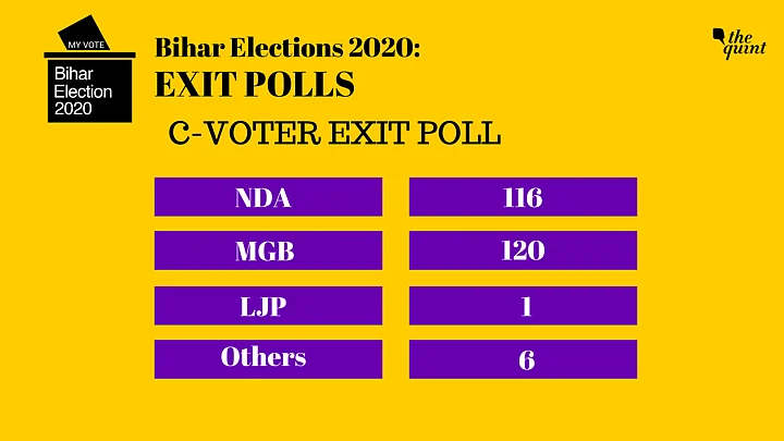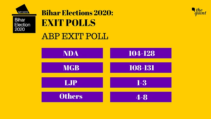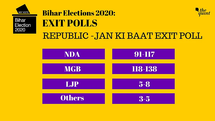The Times Now-CVoter exit poll predicted a hung house after the results. The Republic-Jan Ki Baat Survey gave 91-117 seats to the NDA i.e. the alliance between Chief Minister Nitish Kumar's JD(U) and the BJP. The ABP exit poll in association with CVoter predicted a neck and neck fight between the NDA and the Mahagathbandhan.