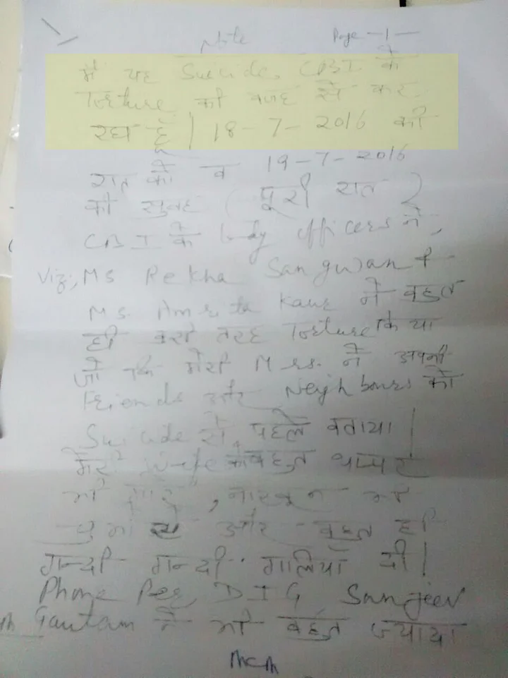 I am committing suicide because of the harassment by the CBI. Rekha Sangwan and Amrita Kaur came to our house during the raid and abused my wife. DIG Sanjeev Gautam asked the lady officers accompanying him to torture “these women so much that they are almost dead”.