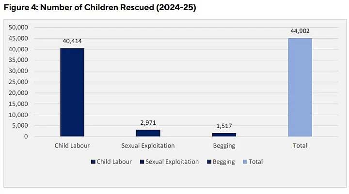 Nearly 45,000 children have been freed from the clutches of child labour, trafficking and child sexual abuse from April 2024 to March 2025, according to a report.