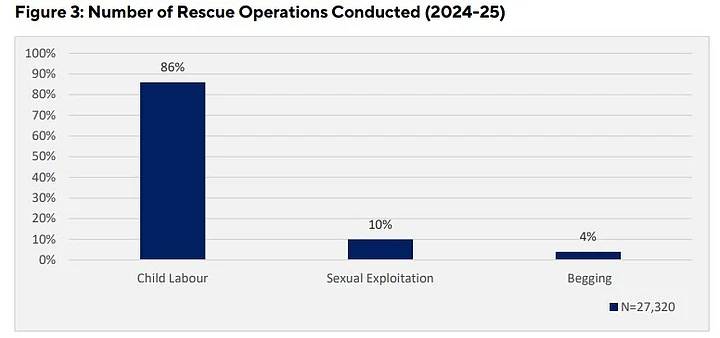 More than 27,300 rescue operations were conducted across 24 states and Union Territories during 2024-25, wherein 86 percent were related to child labour, 10 percent accounted for sexual exploitation, while child begging made up the remaining 4 percent.