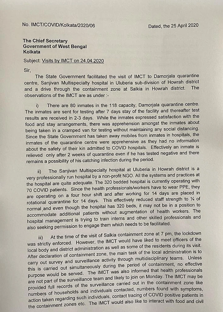 In another letter, on observations made by the IMCT on its visit from Friday, 24 April, to Howrah district, the team raised issues with quarantine centres and surveillance zones. It also enquire about PPE stock and contact tracing or quarantining of individuals who returned from Delhi's Markaz event.
