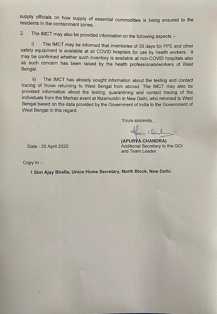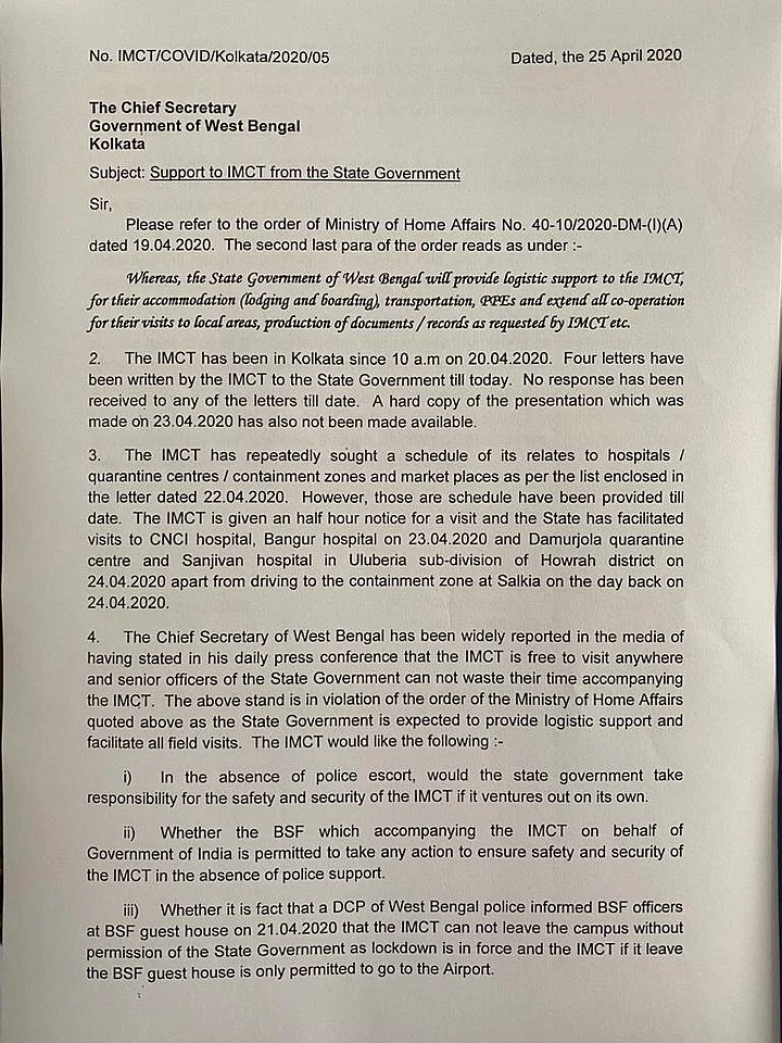The letter addressed to the state chief secretary Rajiva Sinha, and signed by Apurva Chandra, additional secretary to GOI and team leader, mentioned that the team has been in Kolkata since 20 April and has written four letters to the government till date.