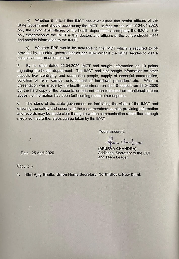 “Whether it is fact that IMCT has ever asked that senior officers of the state government should accompany IMCT. In fact, on the visit of 24 April, only the junior level officers of the health department accompanied the IMCT. The only expectation of the IMCT is that doctors and officers at the venue should meet provide information to the IMCT,” the letter reads.