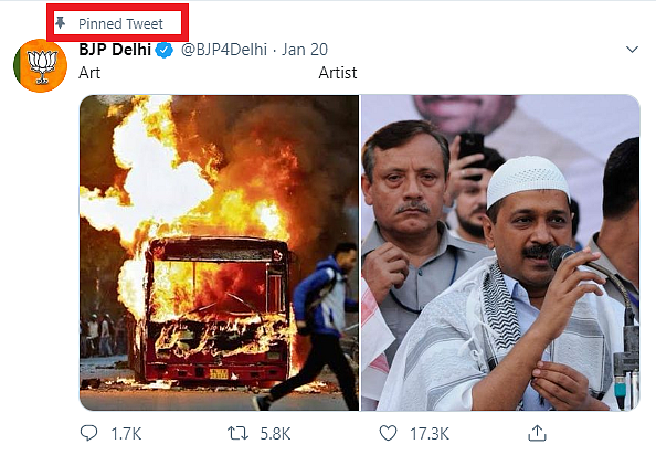 Delhi BJP’s official Twitter handle made an image of a bus burning and Kejriwal in a skullcap its pinned tweet. A pinned tweet features prominently at the top of a Twitter account.