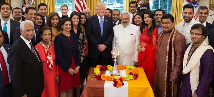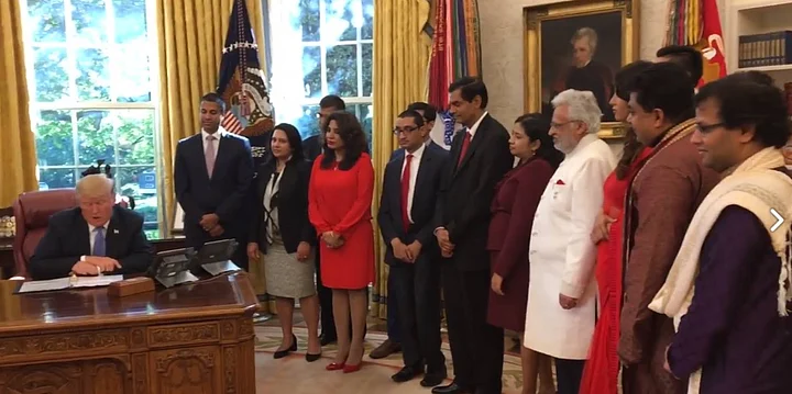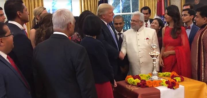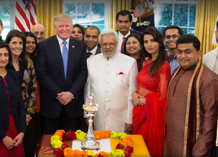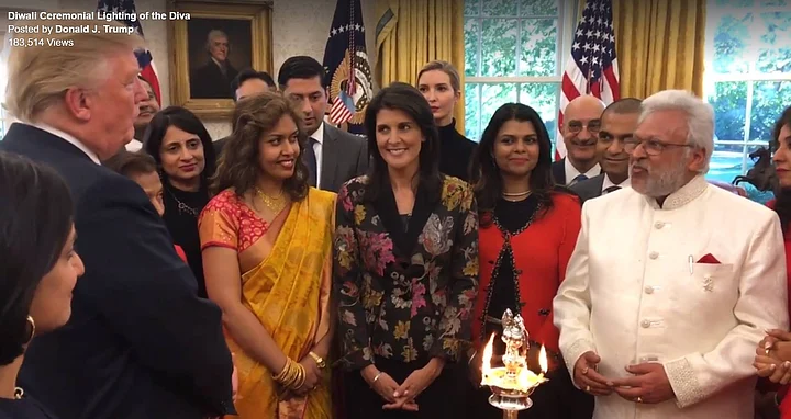 US President Donald Trump celebrated Diwali in the Oval Office of the White House along with senior Indian-American members of the administration, including Nikki Haley, Seema Verma and community leaders.