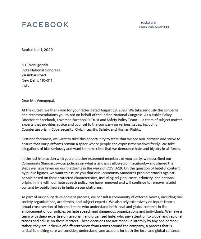 On Thursday, 3 September, Facebook in a reply to a letter written by Congress general secretary (organisation) KC Venugopal, said that the social media giant takes allegations of bias seriously and denounces hate and bigotry in all forms.