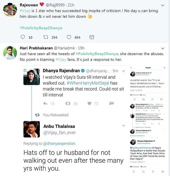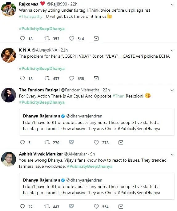 By Sunday evening the trolling had become organised slander and sexually abusive by people claiming to be actor Vijay’s fans. A twitter handle – @kettavanmemes – started a malicious online campaign against the journalist, by creating a hashtag #PublicityBeepDhanya.