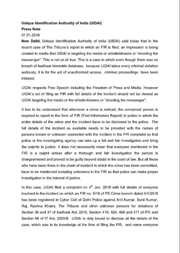 The UIDAI released a statement saying that it takes every criminal violation seriously, and “unauthorised access” by The Tribune and its journalist is what invited the criminal proceedings that have been initiated against them. It also said it respects freedom of speech and the media, and that its FIR shouldn’t be viewed as “shooting the messenger”.