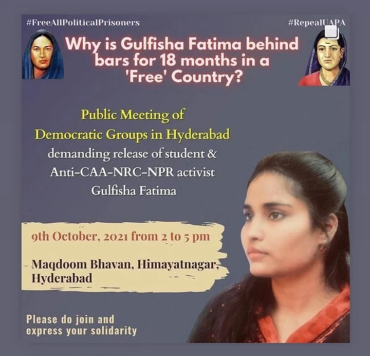 A year and a half after UAPA accused Gulfisha Fatima's arrest, several press conferences were organised in solidarity with her and other political prisoners who have been arrested under the charges of 'conspiring the Delhi riots' by Delhi Police.