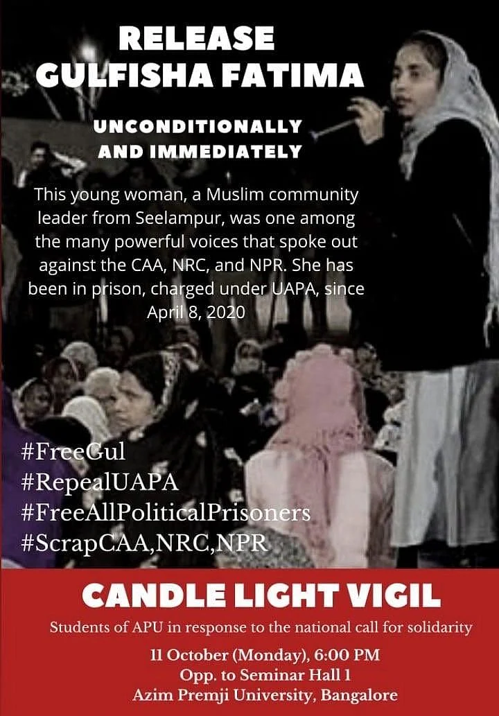 A protest organised at Bengaluru's Azim Premji University for the unconditional and immediate release of Fatima.