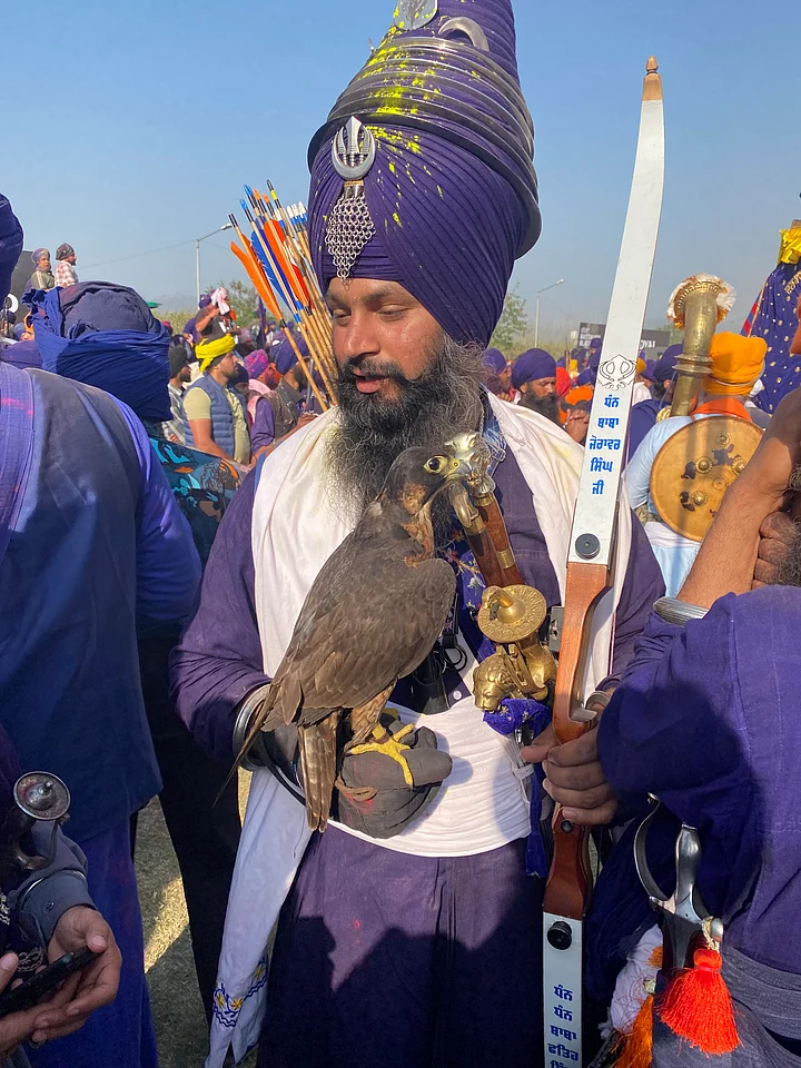Within an hour, various Sikh groups enter the stadium, one by one. Leading the procession was the Buddha Dal – Nihang Sikhs on horses, elephants and camels, with many flying their pet falcons. The tenth Guru also had a goshawk, and is hence lovingly called Baajaan Wala. So the royal sport of falconry is famous among Sikhs.