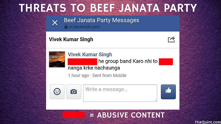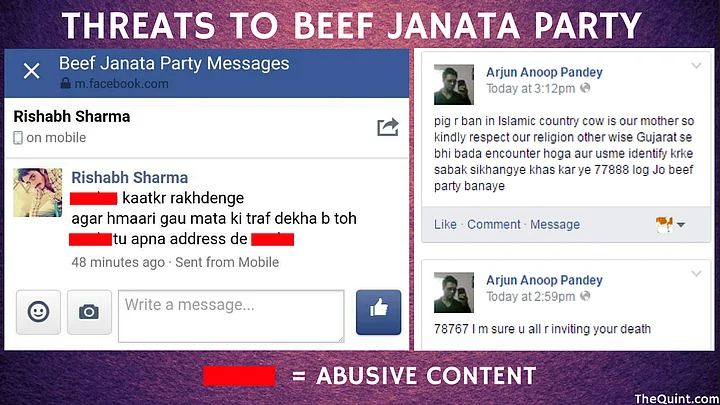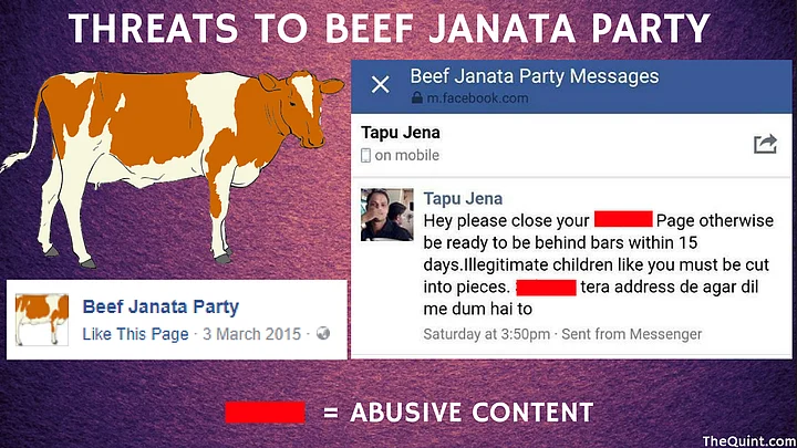 We receive a death threat every two or three weeks, and abusive messages directed at our families. There are people who send threatening messages claiming to know where we stay. Some of them even pose as anti-BJP guys to get friendly and find out our identities. But just a simple visit to their Facebook profiles is enough to show that they are anything but anti-BJP. A lot of the death threats we receive on the page are through fake accounts.Admin, Beef Janata Party