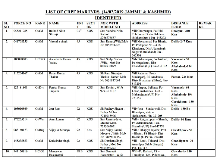 According to the official list of the martyrs, the most number of casualties was from Uttar Pradesh – at 12. Of the martyred CRPF personnel, four hailed from Punjab and five from Rajasthan.