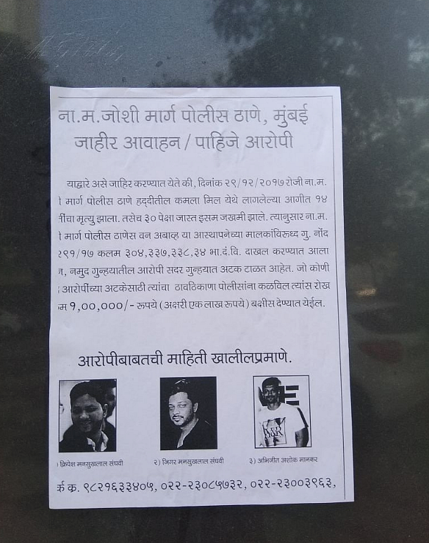 A reward of Rs 1 lakh was announced to anyone providing information about the whereabouts of the co-owners of '1 Above' pub – Kripesh Mansukhlal Sanghvi, Jigar Sanghvi and Abhijeet Mankar – in the Kamala Mills compound, a Mumbai Police spokesperson said on Friday, 5 January.