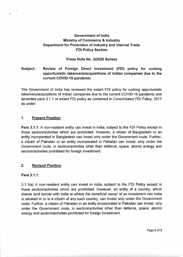 For India, the People's Bank of China increasing its stake in Housing Development Finance Corp Ltd is said to be one of the immediate triggers for this decision. As per a filing on 11 April, the People's Bank of China’s share in HDFC had increased from 0.8% to 1.01%.