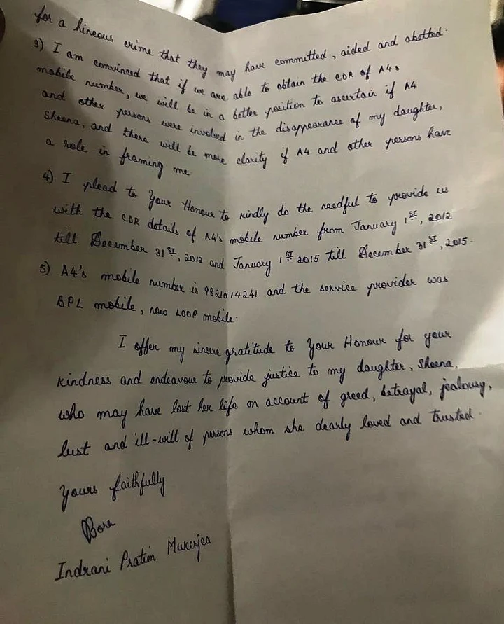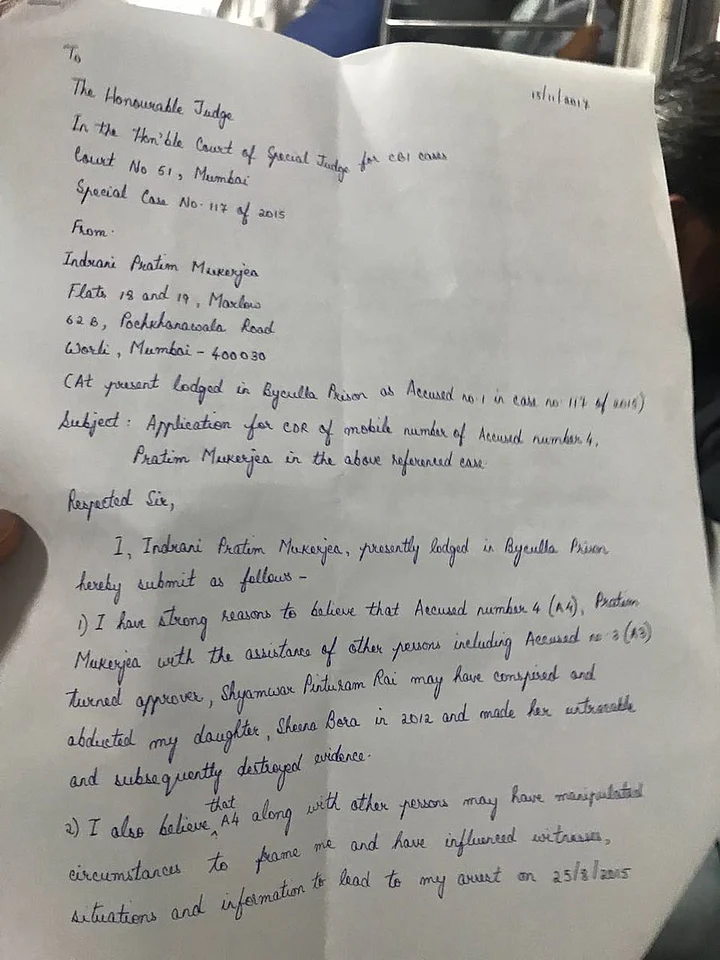 Indrani said she believes that Peter and others may have manipulated the circumstances to frame her and influence witnesses, situations and information that led to her arrest "for the heinous crime that they may have committed, aided and abetted".