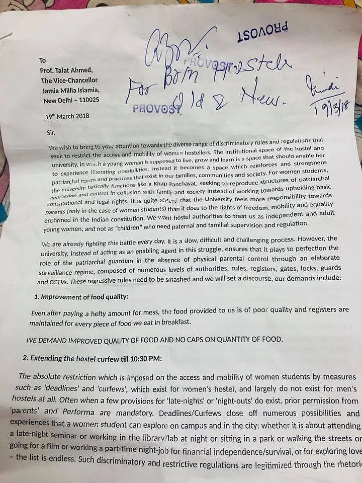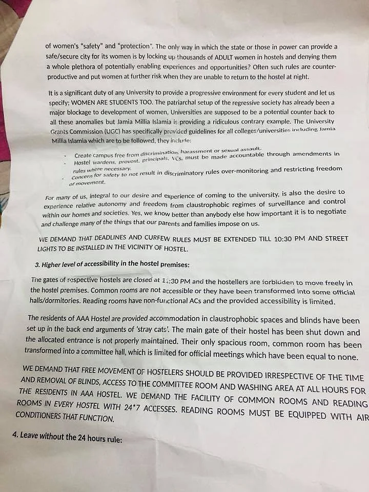 According to a Facebook post by Pinjra Tod, an activist group, the students, as part of their protest, demanded that they also be allowed greater accessibility of hostel premises, reading room and common room in every hostel with 24 hour accessibility, and improvement in food quality, among others.