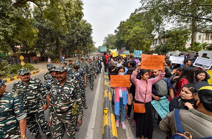 The protesters gathered at the Mandi House and started marching towards the Parliament amid the presence of a huge police posse. Police personnel blocked roads leading to Connaught Place to prevent traffic snarls.