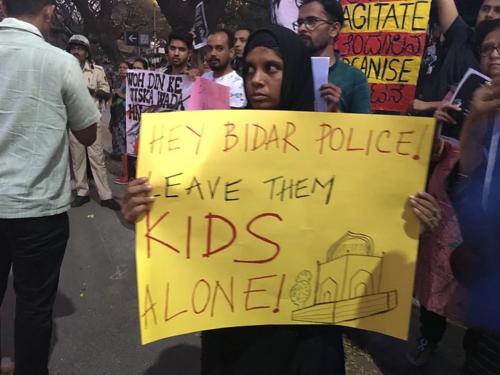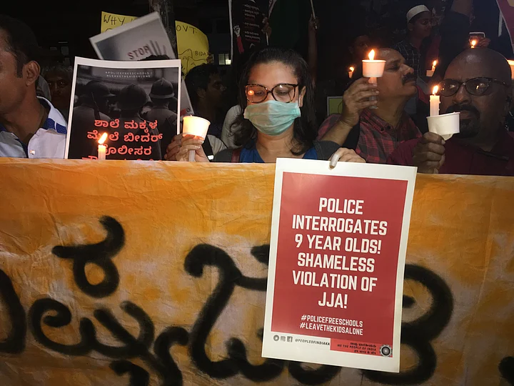 Amid cries of ‘Bidar Police down, down’, several angry parents, activists and citizens of Bengaluru came together to raise their voices against the ‘inhuman’ behaviour of the Bidar police. Over the last week, cops have turned up at a local primary school almost everyday, to interrogate minors for hours on end, over charges of staging a ‘seditious’ play at a school function.