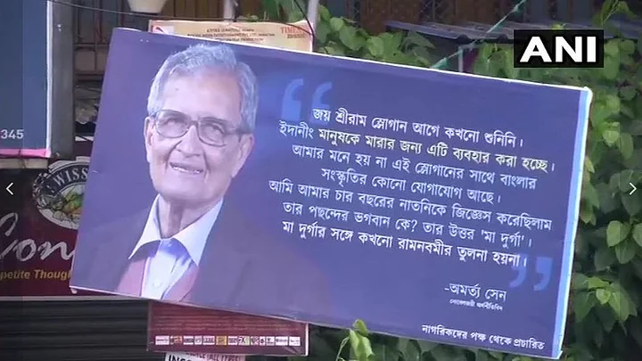 "I have never heard the 'Jai Shri Ram' slogan before. It is being used to thrash sections of people. I feel this slogan is alien to Bengal's culture," reads the billboard, quoting Sen's comments that he made during an interaction at the Jadavpur University on 5 July.