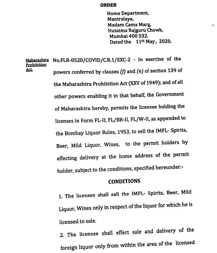 The Maharashtra government on Tuesday, 12 May, announced that it will allow liquor shops to provide home delivery services subject to conditions for both the buyer and the seller.