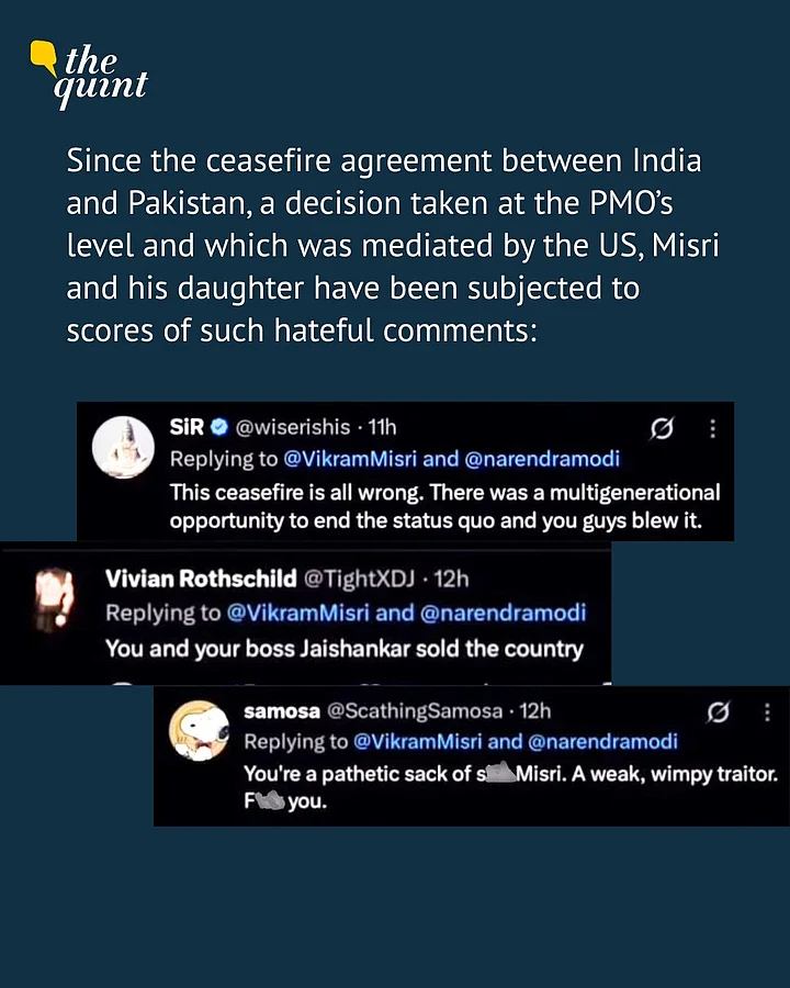 Some of the abusive comments directed at Vikram Misri labelled him a "traitor" and "gaddar," accusing him of "selling the country." The online attacks included strong language and personal insults, with many criticising him for the ceasefire agreement that India did with Pakistan.