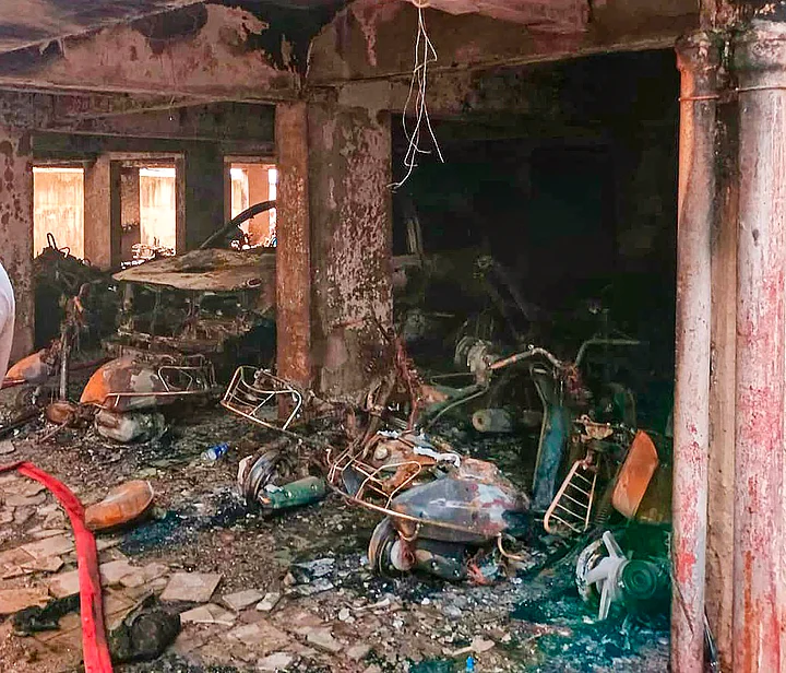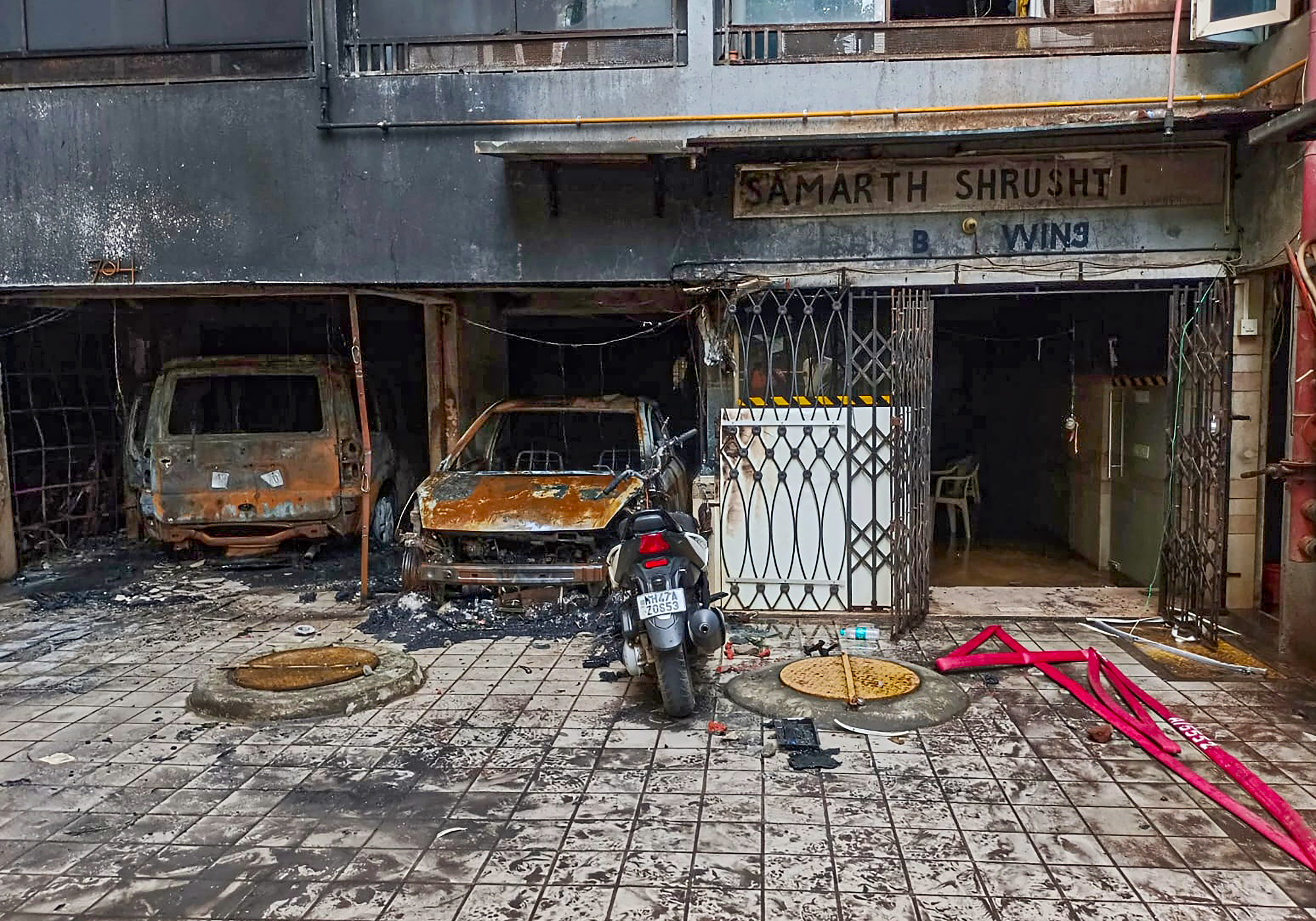 Charred vehicles after a fire broke out in a multi-storey residential building in Goregaon area of Mumbai.