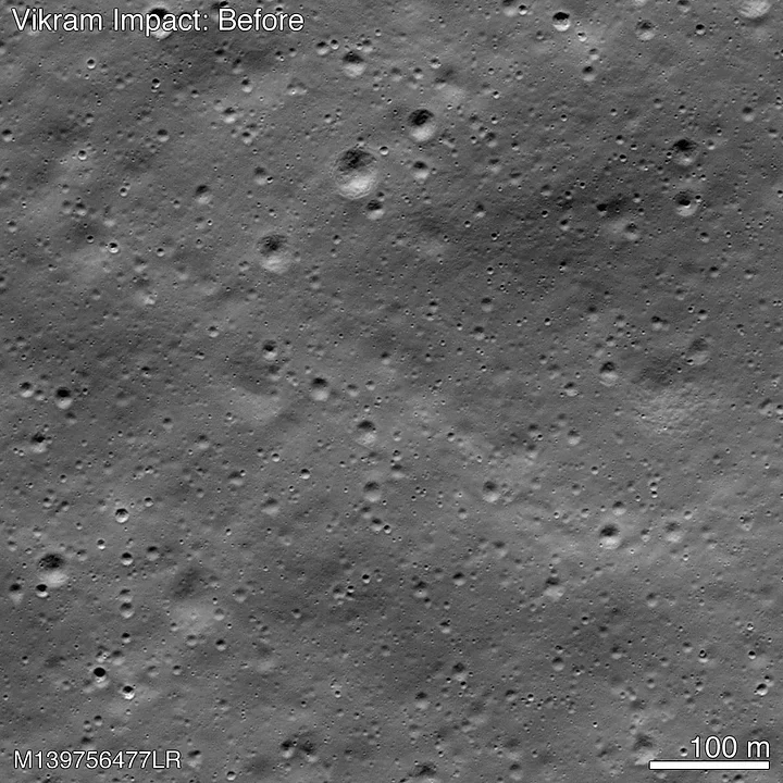 NASA released an image taken by its Lunar Reconnaissance Orbiter (LRO) that showed the site of the spacecraft's impact (6 September in India and 7 September in the US) and associated debris field, with parts scattered over almost two dozen locations spanning several kilometers.