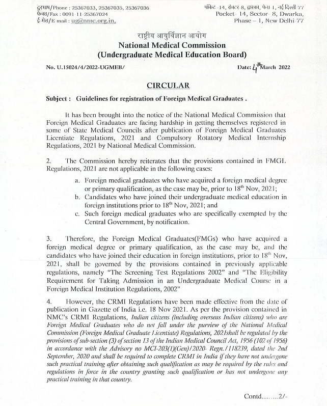 Students who have received a foreign medical degree or those who have joined their undergraduate medical education in foreign institutions prior to 18 November 2021 will be allowed to complete their internships in India.