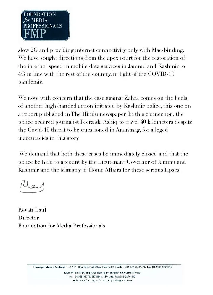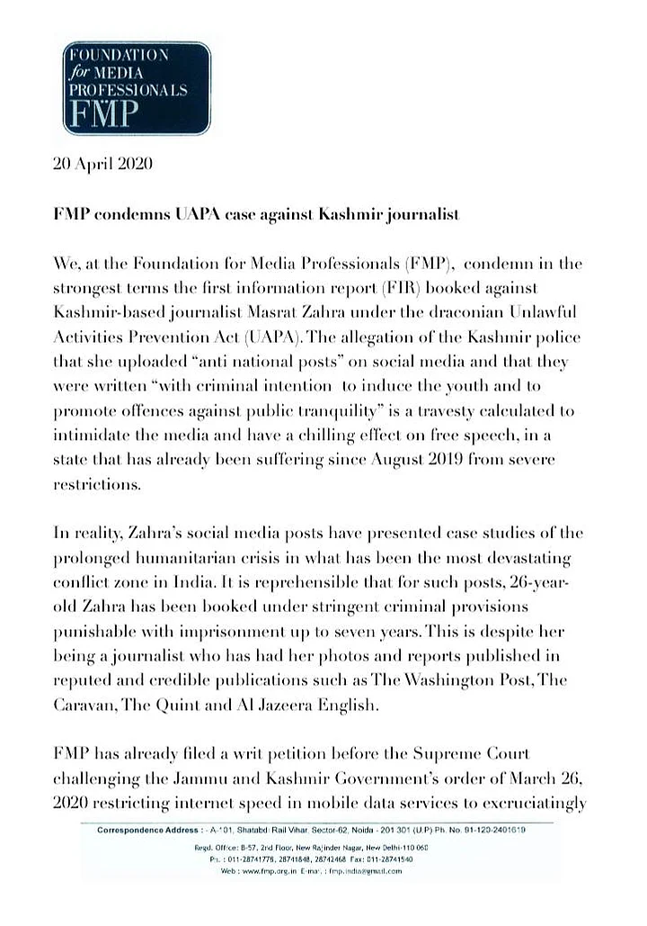 The FMP added that in reality Zahra’s social media posts “have presented case studies of the prolonged humanitarian crisis in what has been the most devastating conflict zone in India,” adding that the cases against the journalist should be immediately closed.