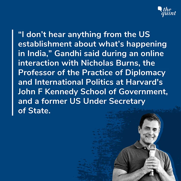 During an online interaction with Nicholas Burns, the Professor of the Practice of Diplomacy and International Politics at Harvard's John F Kennedy School of Government, and a former US Under Secretary of State, the Congress leader also asserted that the United States was silent about developments in India.
