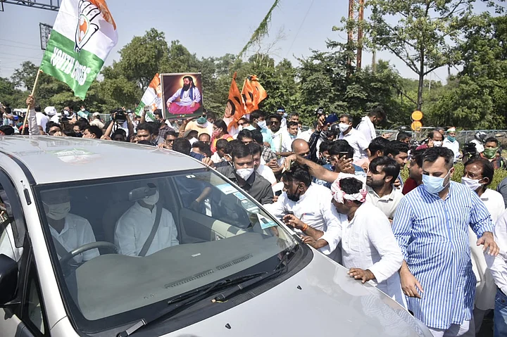 The car in which the Gandhis were travelling was flanked by anti-UP government protesters earlier, as they reached Noida, via the Delhi-Noida-Direct (DND) route.
