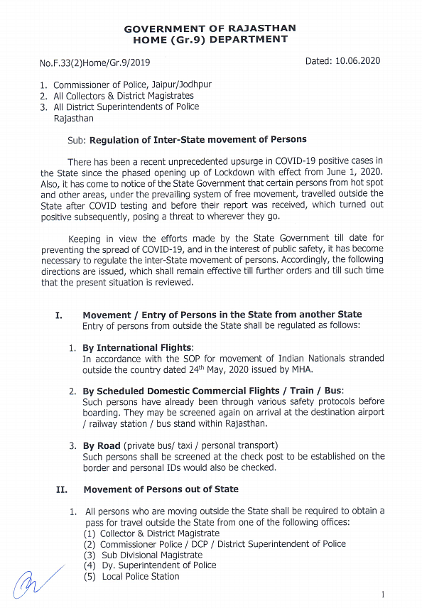 Facing a spike in the number of COVID-19 cases in the state, the Rajasthan government on Wednesday, 10 June, issued orders to regulate all inter-state movement.